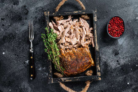 Bbq slow roast puilled pork meat in a wooden tray. Black background. Top view