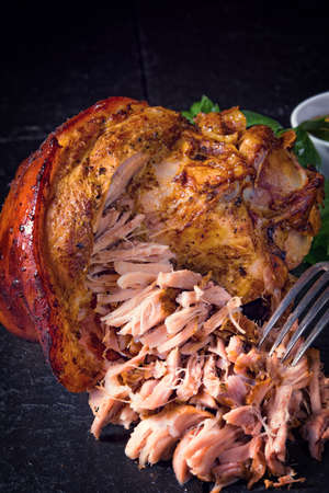 Selective focused pulled pork roasted joint with copy space.