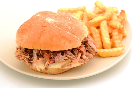 pulled pork sandwich and french fries on plate