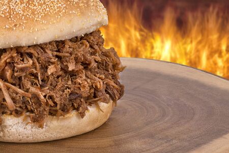 Close up on pulled pork sandwich, flame in background.