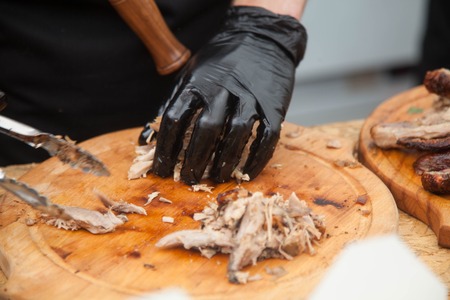 Grill restaurant kitchen. Chef hands in black cooking gloves holding smoked pulled pork with pickles on wooden board.