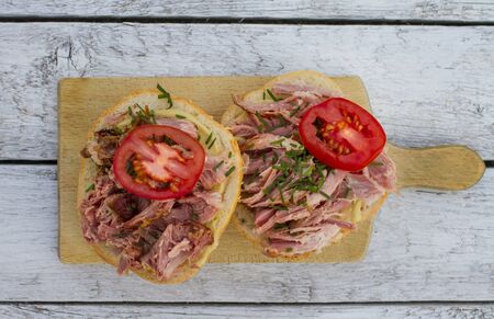Barbeque Pulled Pork ciabatta open Sandwich with BBQ Sauce, red onion and chili pepper on parchment paper on oval plate on old white wooden planks with parsley, view from above, close-up