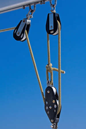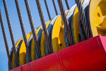 Close up of yacht equipment. Part of yacht with red ropes and capstan. Sailing boat pulley with nautical rope. Marine background.