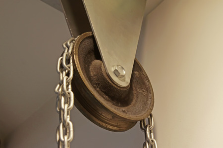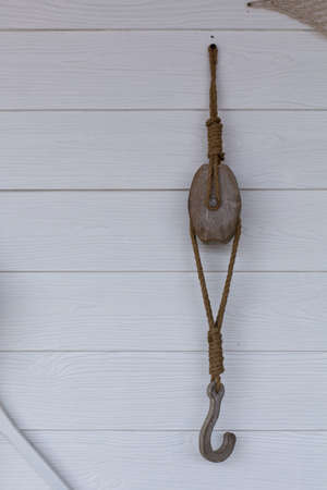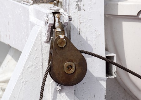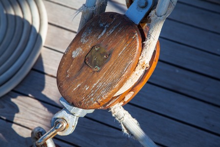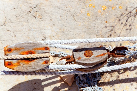 Aged rusted wooden pulley in Mediterrantan port as a traditional gear