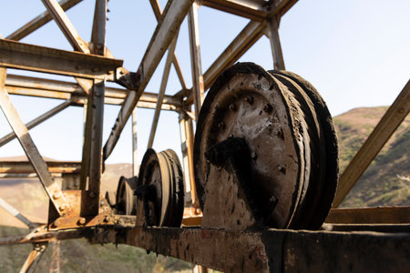 Rusted metal iron wheel from industrial coal mining industry in abandoned ancient building.