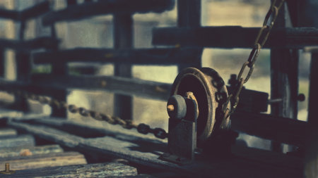 A close up view of a weathered wooden pulley system rests on a rustic dock. The worn metal parts and chains tell stories of the past as the sun casts gentle shadows.