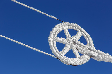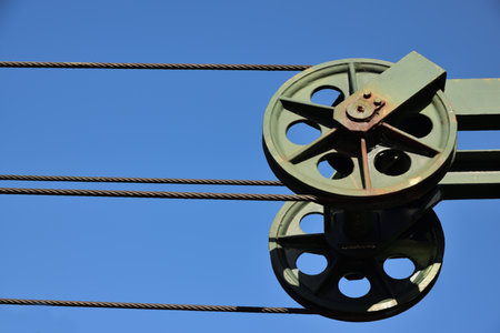Rolling over metal, a steel cable stretches against a blue sky as background