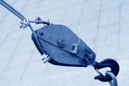 Business and commerce. Cranes at port area, lifting block, cargo container yard. Industrial detail, part of heavy machinery