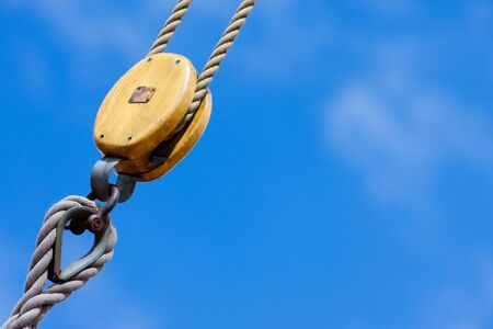 A traditional wooden block and rigging ropes of American coastguard tallship Eagle visiting Reykjavik Harbour, Iceland. 11 June 2021.