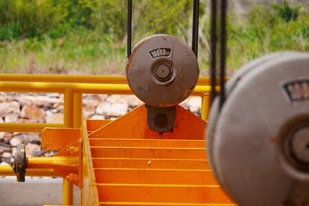 Close-up view of steel wire rope on a heavy-duty crane, showcasing the functionality of machinery in construction. Perfect for industrial-themed projects.
