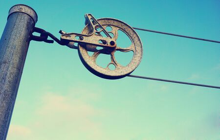 Old wooden pulley block at sunset, color toning applied, selective focus.
