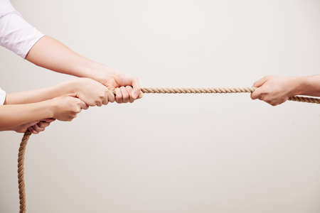Teamwork, hands and tug and war while joining forces and pulling a rope for battle against competitors. Closeup of strong businessperson fighting for power, leadership and equality rights