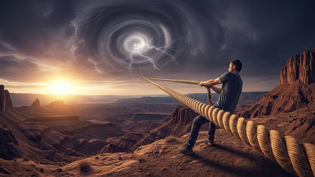 A man is depicted pulling a rope toward a swirling vortex in a dramatic landscape. The scene features warm colors from a sunset, with a textured rope and stylized rock formations. The lighting creates a sense of depth and mystery. This image is suitable for various commercial uses related to themes of challenge and overcoming obstacles.