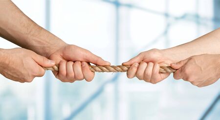 Tug of war, two businessman pulling a rope in opposite directions over defocused background with copy space