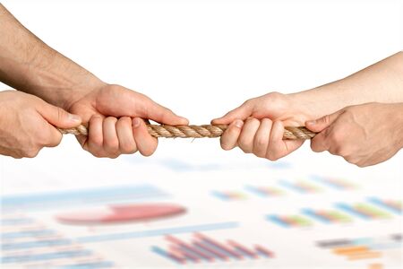 Two opposing teams having a tug of war pulling on opposite ends of a rope in a display of strength conceptual of competition challenge and determination on white