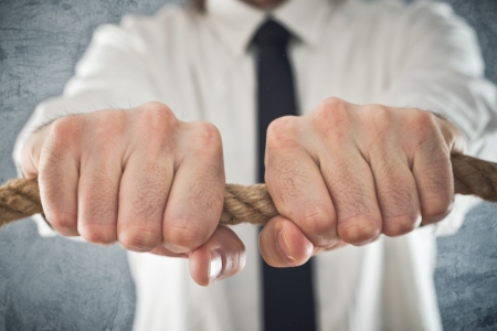 Businessman holding tight to a rope. Concept of business problems, difficult business situation.
