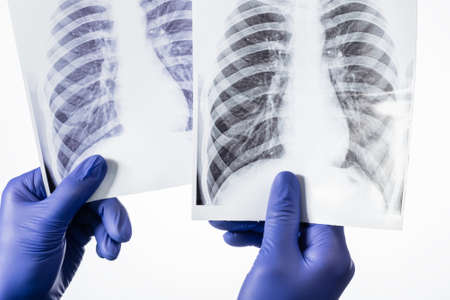 X-ray of the human chest in the hands of a doctor, X-ray of the lungs. The doctor diagnoses pneumonia of the lungs. A doctor checks a chest x-ray film in a hospital.