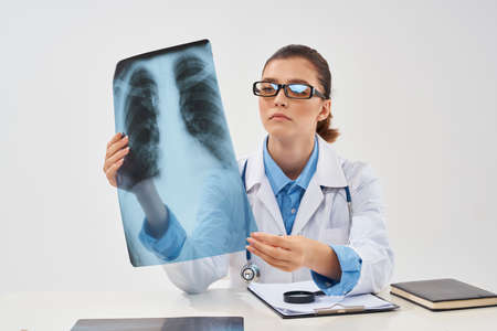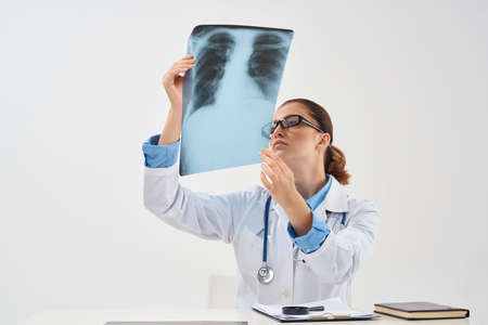 Perplexed focused doctor woman with X-ray of lungs, fluorography, roentgen isolated on white background. Female doctor in medical gown stethoscope.
