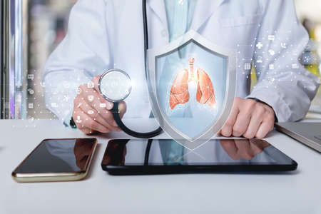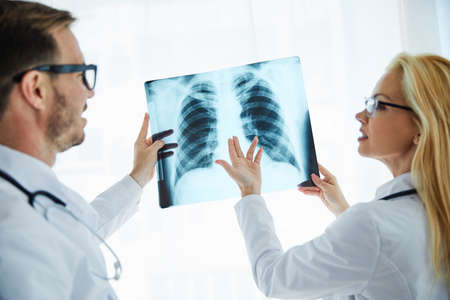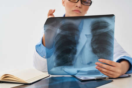 Pulmonologist therapist examining an x-ray of lungs. Health care and medical insurance concept