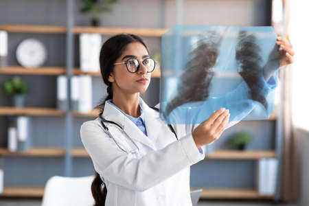 Busy serious millennial pretty indian woman doctor in white coat and glasses looking at lungs x-ray in clinic