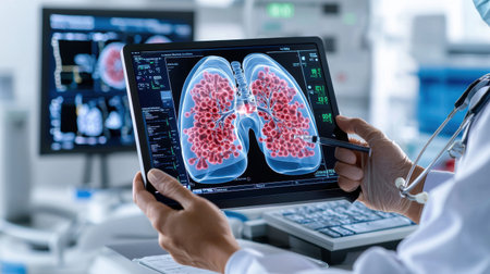 A doctor is holding a tablet with a picture of a lung on it. The lung appears to be diseased, and the doctor is examining it closely. Concept of concern and urgency