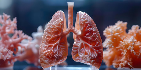 Close-up of human lungs with a focus on their detailed texture and structure, including the bronchial tubes and alveoli, set against a clean background.