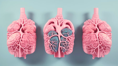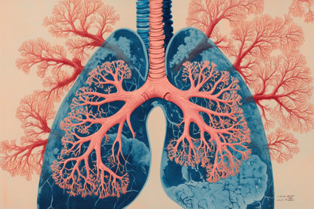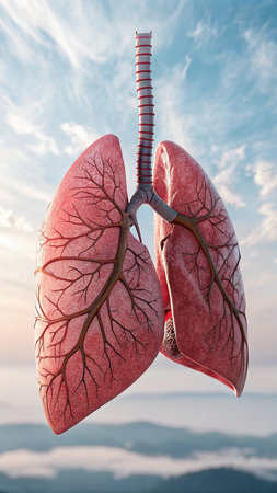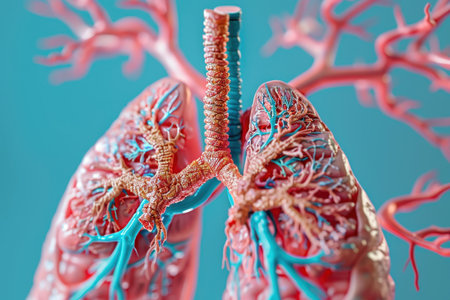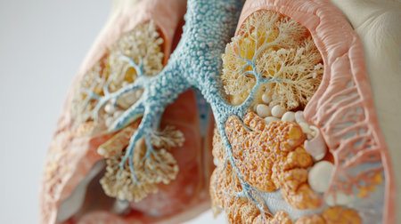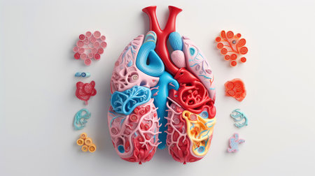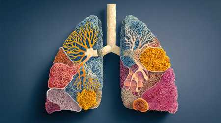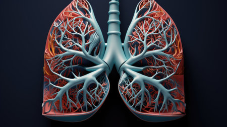 Illustrative representation of human lungs showcasing intricate structures, vibrant colors, and detailed textures of lung tissue and biological elements