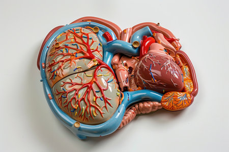 A model of a heart and lungs with red veins. The model is made of plastic and is on a white background