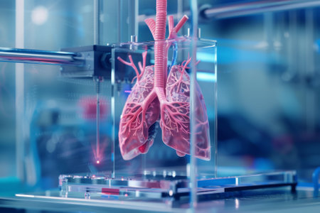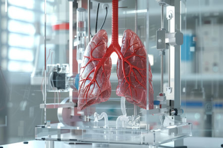 Detailed 3D render depicting a lung being bioprinted in a high-tech medical laboratory. The image highlights innovation in healthcare and advanced technology in medical science.