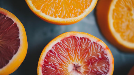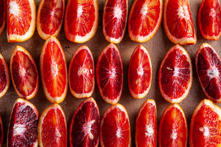 Slices of blood oranges on a beige background. Food background. Top view. Flat lay.