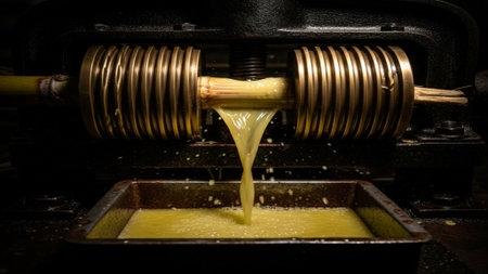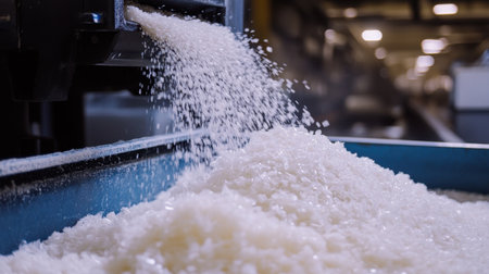 High-quality image of white granulated sugar being poured from an industrial machine into a blue container, showcasing food processing in action.