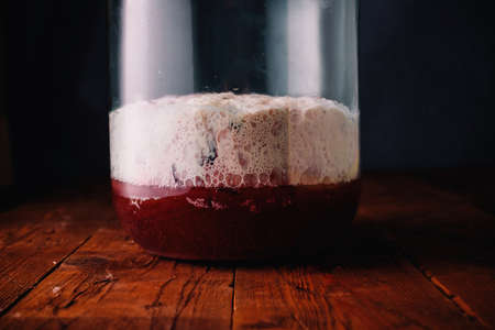 Jar of rye bread, hibiscus homemade kvass, kvass in process of making. High foam from sugar and yeast, rustic background. Slavic drink, closeup