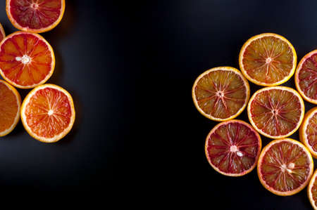 red Sicilian orange Moro, juicy Mediterranean fruit, fruit with vitamin C, red orange, cut citrus, dark background