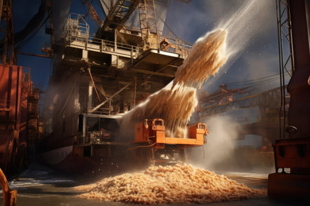 A big machine pours sand onto a pile, creating a growing mound of sand, Ship crane lift-off slings of sugar bags cargo from truck and load into ship, AI Generated