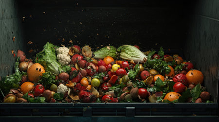 A vibrant collection of fresh vegetables and fruits displayed in a dark setting, showcasing their vivid colors and textures, ideal for food-related projects.