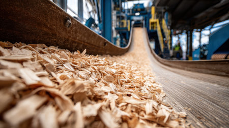 Wood Shavings on Conveyor Belt in Industrial Facility with Machinery and Equipment for Processing Timber and Wood Products in Factory Environment