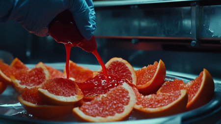 A vibrant scene showcasing the pouring of fresh grapefruit juice over juicy orange segments, capturing the essence of healthy and delicious culinary delights. Perfect for food promotion.