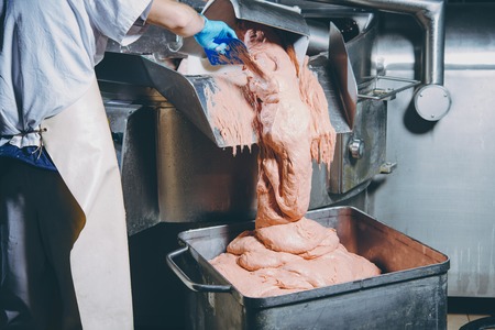This image captures a modern meat processing machine in action, shredding fresh meat in a clean and efficient industrial kitchen environment.