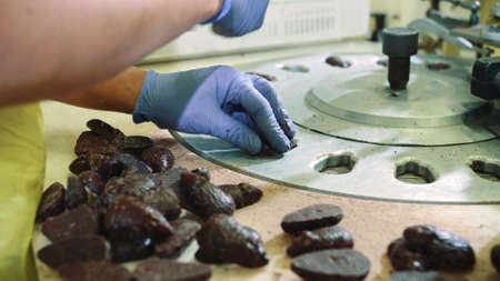 Candy factory. Crop hands putting sweets into wrapping machine. Hands of unrecognizable female worker putting chocolate candies into wrapping machine on confectionery factory.