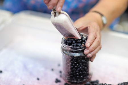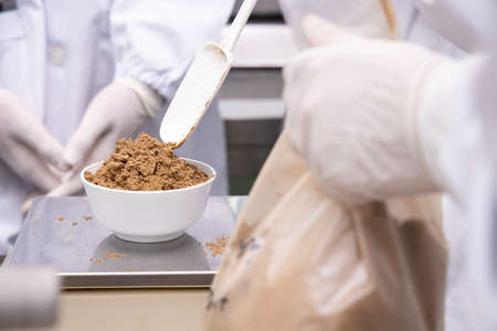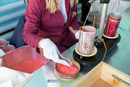 Close up on midsection of caucasian female measuring dry fruit at the laboratory - Unknown woman putting product to the laboratory beaker to test it - development and expertise concept