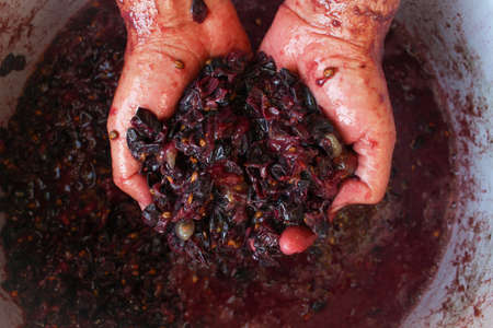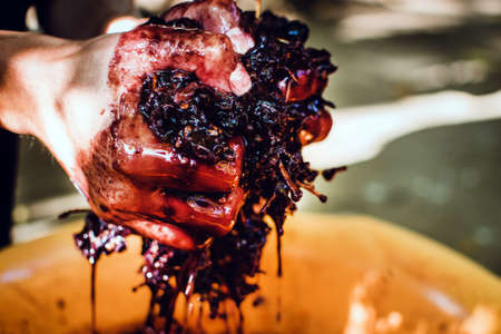 Winemaking at home, squeezing grape juice by hand, the natural fermentation process. new