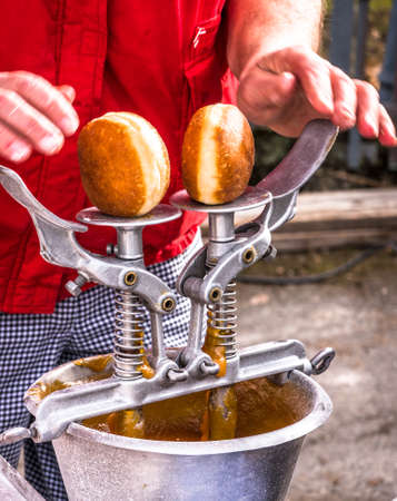 Freshly squeezed grape juice during food and wine festival. Traditional Romanian sweet drink, sugar free, intense red color
