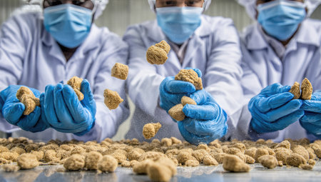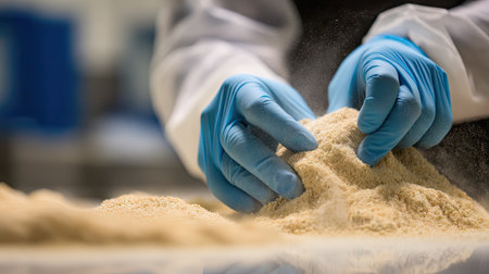 A laboratory worker skillfully manipulates a fine powder substance with blue gloves, highlighting a focus on safety and meticulous scientific research practices.
