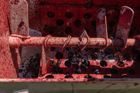 Artisan Wine Press: The Heart of Traditional Winemaking in a Rustic Vineyard Setting. The Art of Winemaking: A Mechanical Wine Press Capturing Tradition and Flavor.