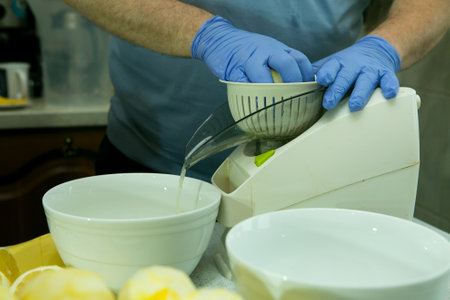 The process of making limoncello lemon liqueur at home. A man squeezes lemon juice on a food processor.