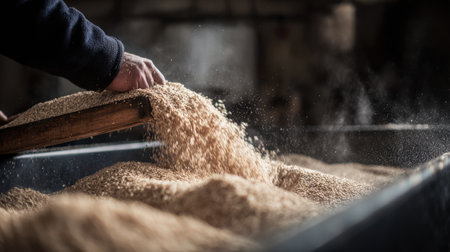 A close-up view captures a hand skillfully sifting grain amidst natural light, emphasizing the grains' texture and the rustic charm of traditional farming practices.