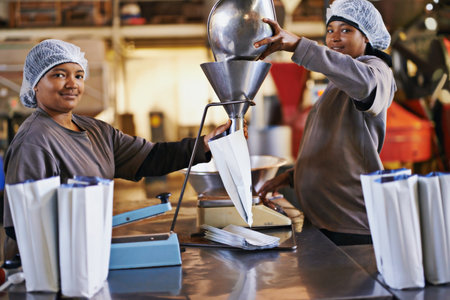 We only bag the best. workers in a coffee packaging and distribution warehouse.