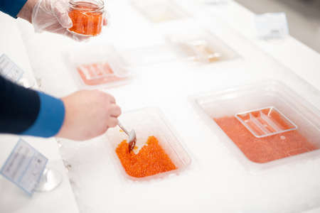 Seller putting caviar into a jar, close-up on hands. counter with fresh caviar at seafood shop