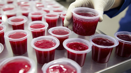 A vibrant scene featuring freshly made fruit jelly in transparent containers, showcasing a glossy texture, perfect for desserts or snacks in a clean kitchen environment.