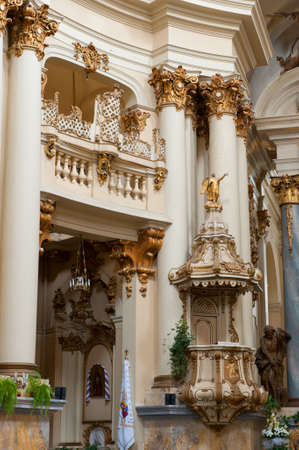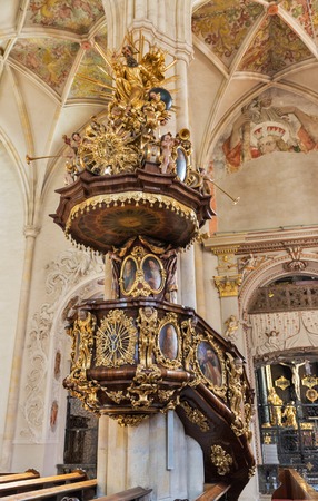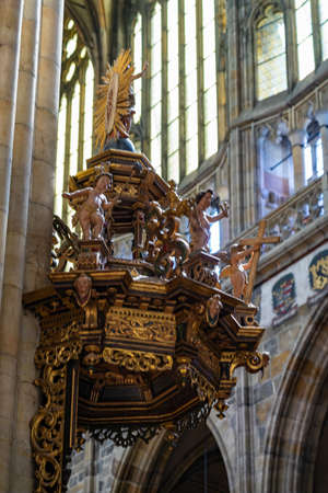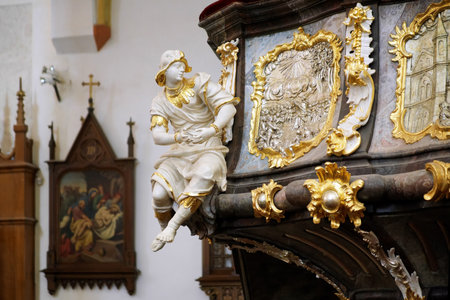 Sculpture and decoration on the ambon of the Church of Presentation of Virgin Mary in Ceske Budejovice, Czech Republic